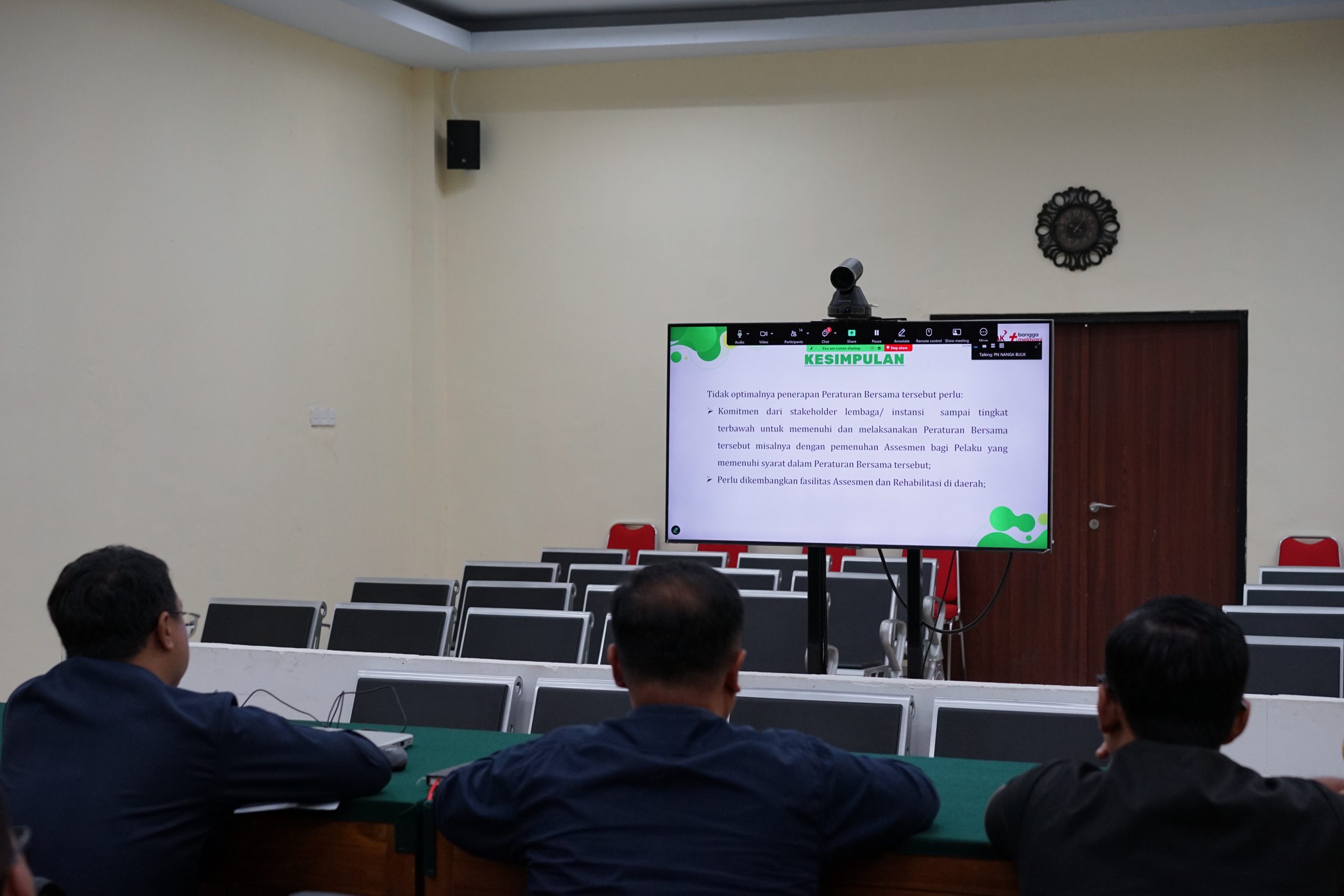 bertempat di Ruang Sidang Utama Pengadilan Negeri Nanga Bulik dilaksanakan acara Coffee Morning dengan tema “Problematika Penegakan Hukum Tindak Pidana Narkotika” yang diselenggarakan oleh Pengadilan Tinggi Palangkaraya secara online/daring. Acara diikuti oleh Ketua Pengadilan Negeri Palangkaraya Bapak Evan Setiawan Dese, S.H., M.H. dan di ikuti oleh Para Hakim, Panitera dan Panitera Muda Pidana pada Pengadilan Negeri Nanga Bulik. Dalam acara tersebut Ketua Pengadilan Negeri Nanga Bulik mendapat kesempatan sebagai Pemateri dengan topik “Penerapan Perjanjian Bersama atas Penanganan Pelaku Korban Penyalahguna dan Pecandu Narkotika” .