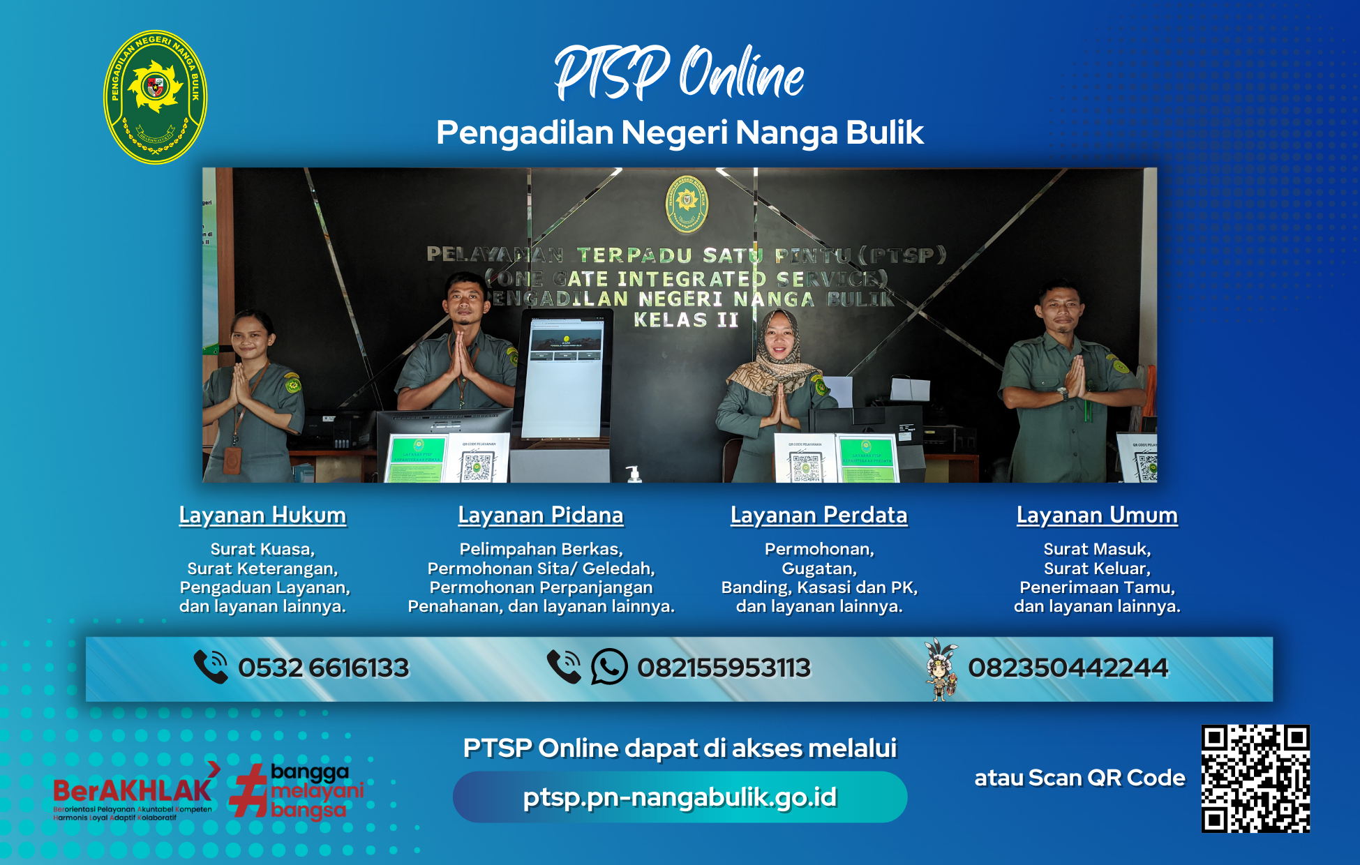 Dalam rangka meningkatkan pelayanan kepada masyarakat pencari keadilan guna mewujudkan pelayanan yang cepat, mudah, transparan, terukur, dan terjangkau perlu dilaksanakan perubahan terhadap sistem pelayanan. Pengadilan Negeri Nanga Bulik dalam melakukan perubahan sistem tersebut berinovasi untuk memberikan layanan secara daring melalui PTSP Online. PTSP Online dapat diakses melalui link ptsp.pn-nangabulik.go.id
