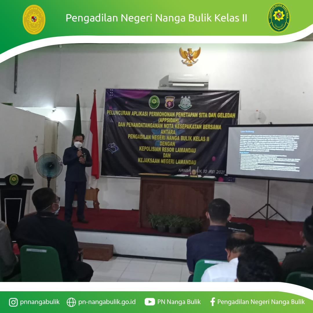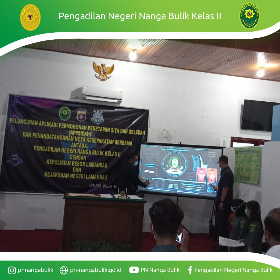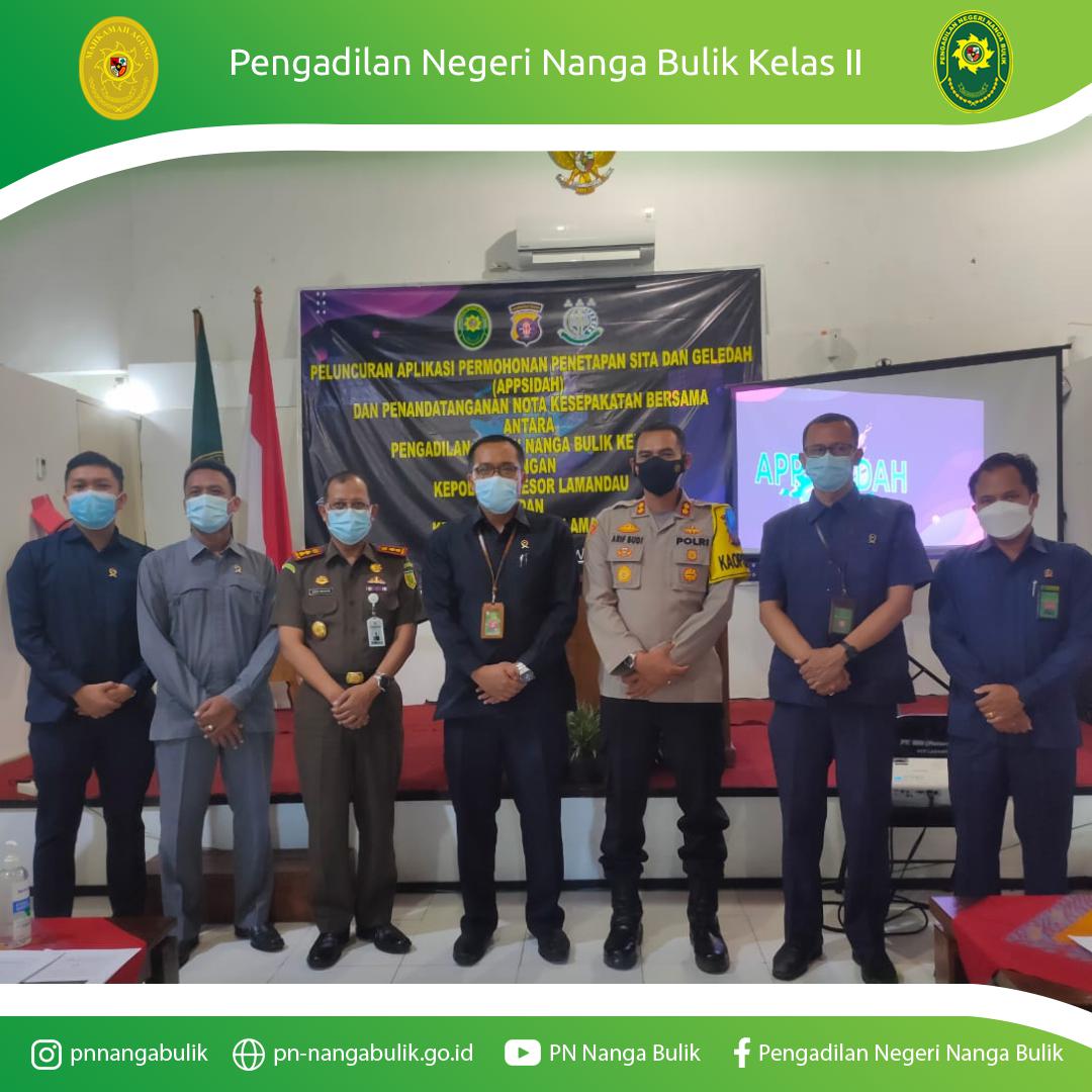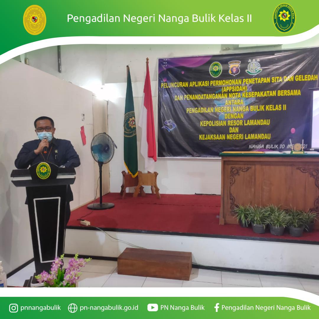 Nanga Bulik – 10 Mei 2021 | Pengadilan Negeri Nanga Bulik Kelas II melaksanakan Acara Peluncuran Aplikasi APPSIDAH (Aplikasi Permohonan Penetapan Sita dan Geledah) bertempat di Ruang Sidang Cakra Pengadilan Negeri Nanga Bulik Kelas II. Acara tersebut dihadiri oleh Kapolres Lamandau beserta seluruh Kapolsek di Kabupaten Lamandau dan Kepala Kejaksaan Negeri Lamandau.