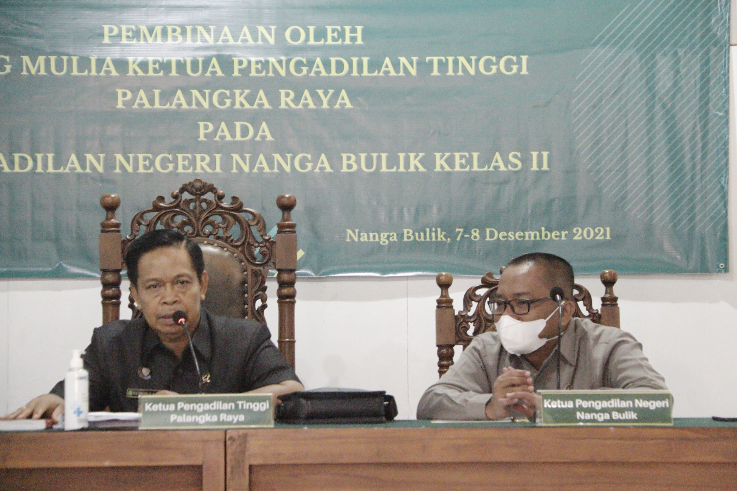 Dalam Sambutannya Ketua Pengadilan Tinggi Palangka Raya menyampaikan dalam kegiatan ini selain dalam rangka melakukan pembinaan, beliau juga ingin langsung bertatap muka dan bersilahturahmi dengan keluarga besar Pengadilan Negeri Nanga Bulik karena selama ini hanya melalui daring. Beliau juga menyempatkan diri untuk berkeliling melihat sarana dan prasarana yang ada dan yang paling utama yang beliau lihat adalah kebersihan WC umum untuk pengunjung pengguna pengadilan dan WC ruang tahanan, beliau memberikan apresiasi karena kebersihannya selalu dipelihara dan dijaga setiap hari. Beliau berpesan kepada seluruh Hakim dan aparatur pengadilan untuk selalu update terhadap setiap perubahan peraturan-peraturan yang baru baik yang disampaikan melalui pembinaan oleh Ketua Mahkamah Agung RI maupun yang diperoleh dari hasil pelatihan atau bimbingan teknis untuk selalu di share kepada rekan-rekan yang lain guna meningkatkan ilmu pengetahuan dan pelayanan hukum kepada kepada masyarakat.