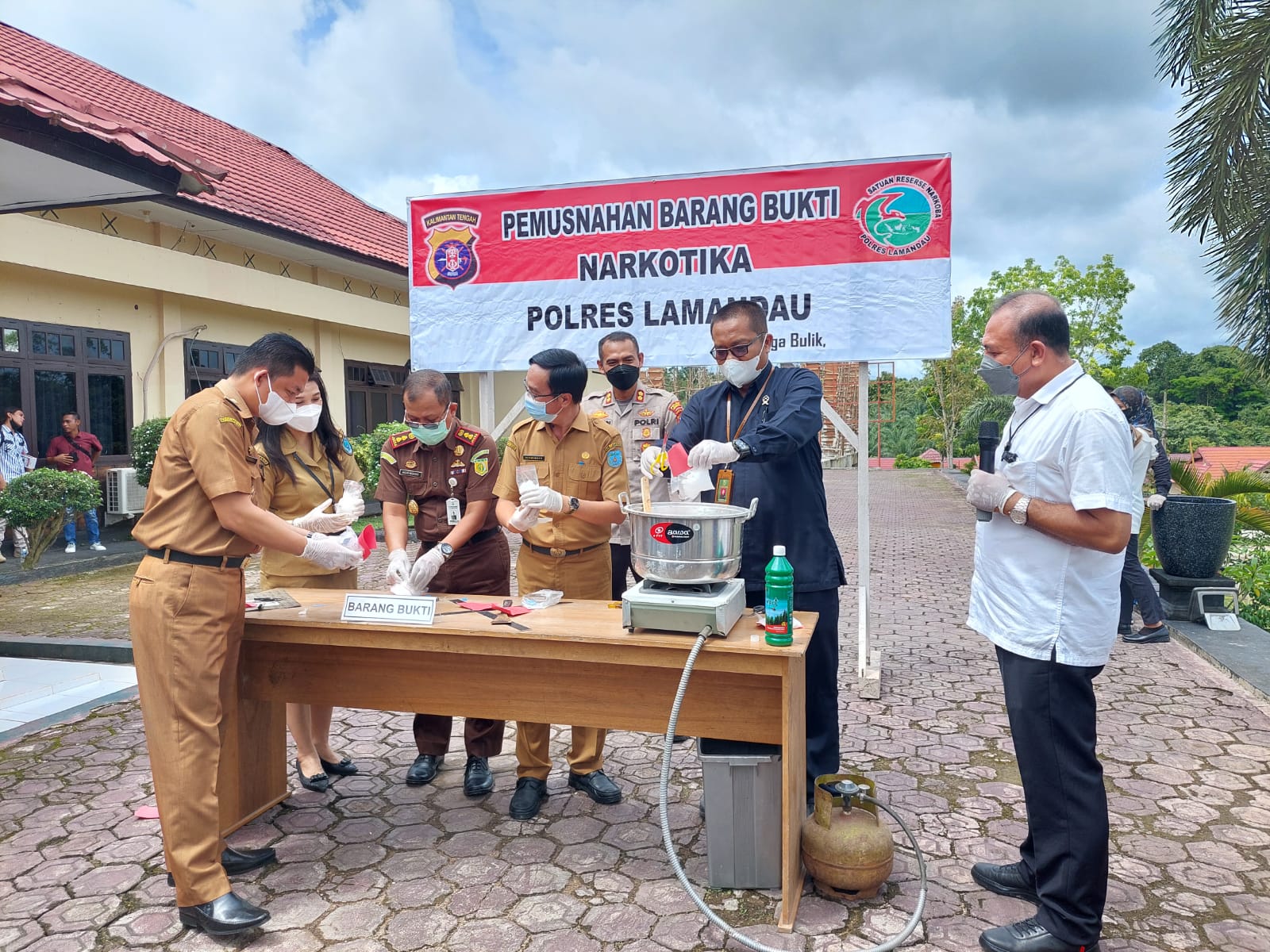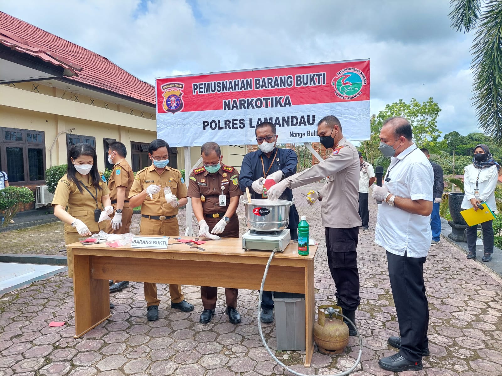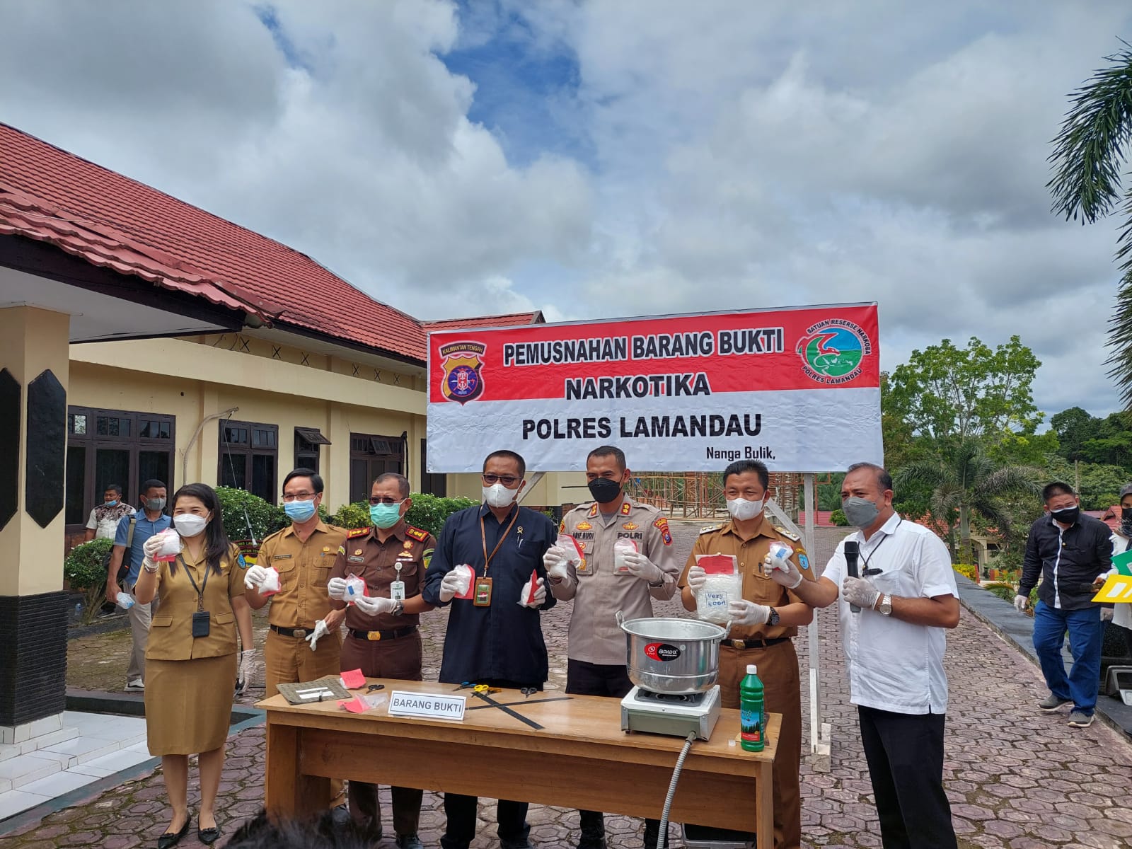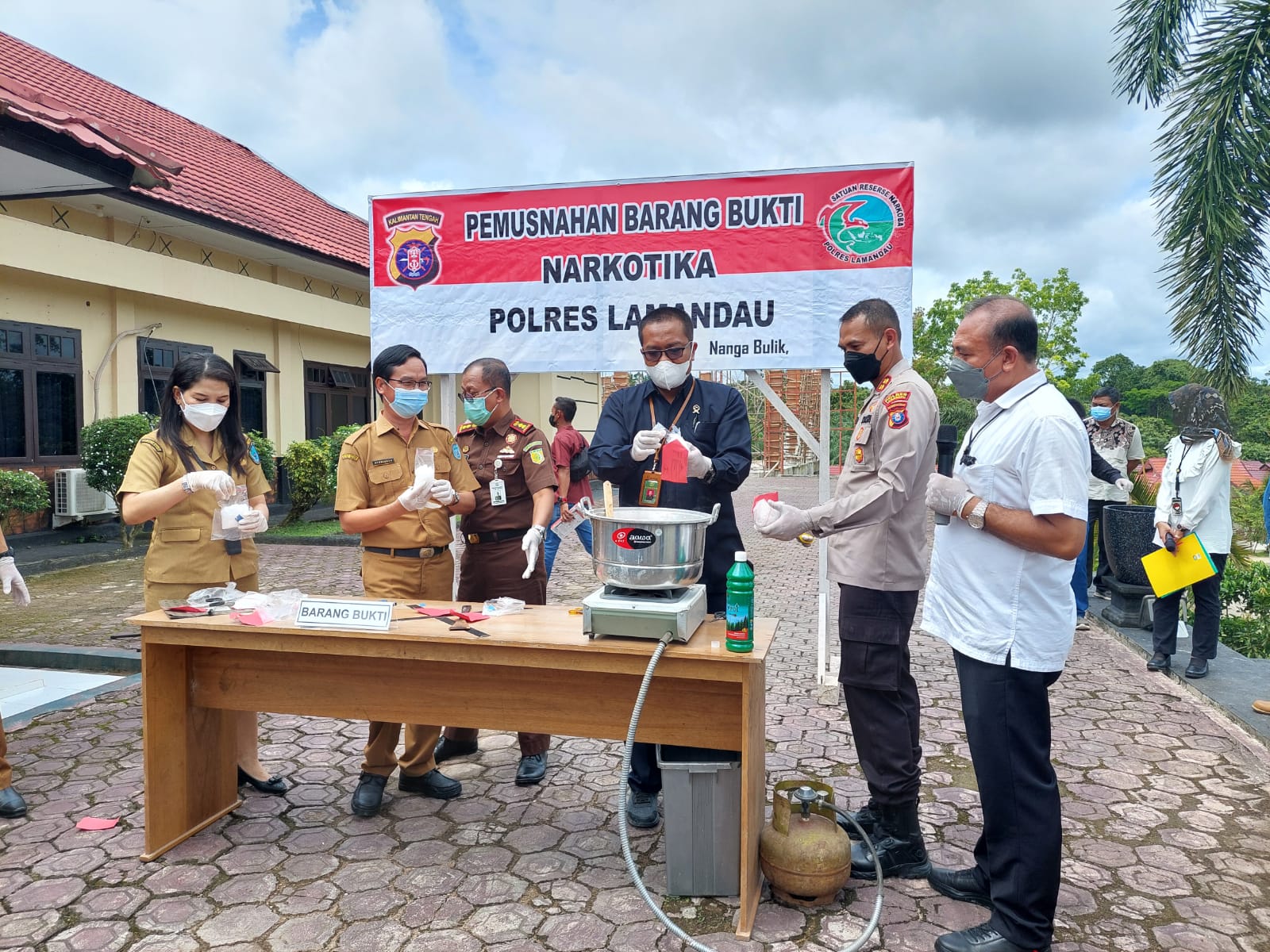 Selanjutnya dilaksanakan acara Pemusnahan barang bukti Narkotika oleh Kapolres Lamandau Wakil Bupati Lamandau dan unsur-unsur terkait dengan cara barang bukti di masukkan ke dalam Panci berisi air mendidih yang di campur pembersih lantai selanjutnya barang bukti tersebut di masukkan kedalam saptitenk di awasi ketat oleh Propam Polres Lamandau.