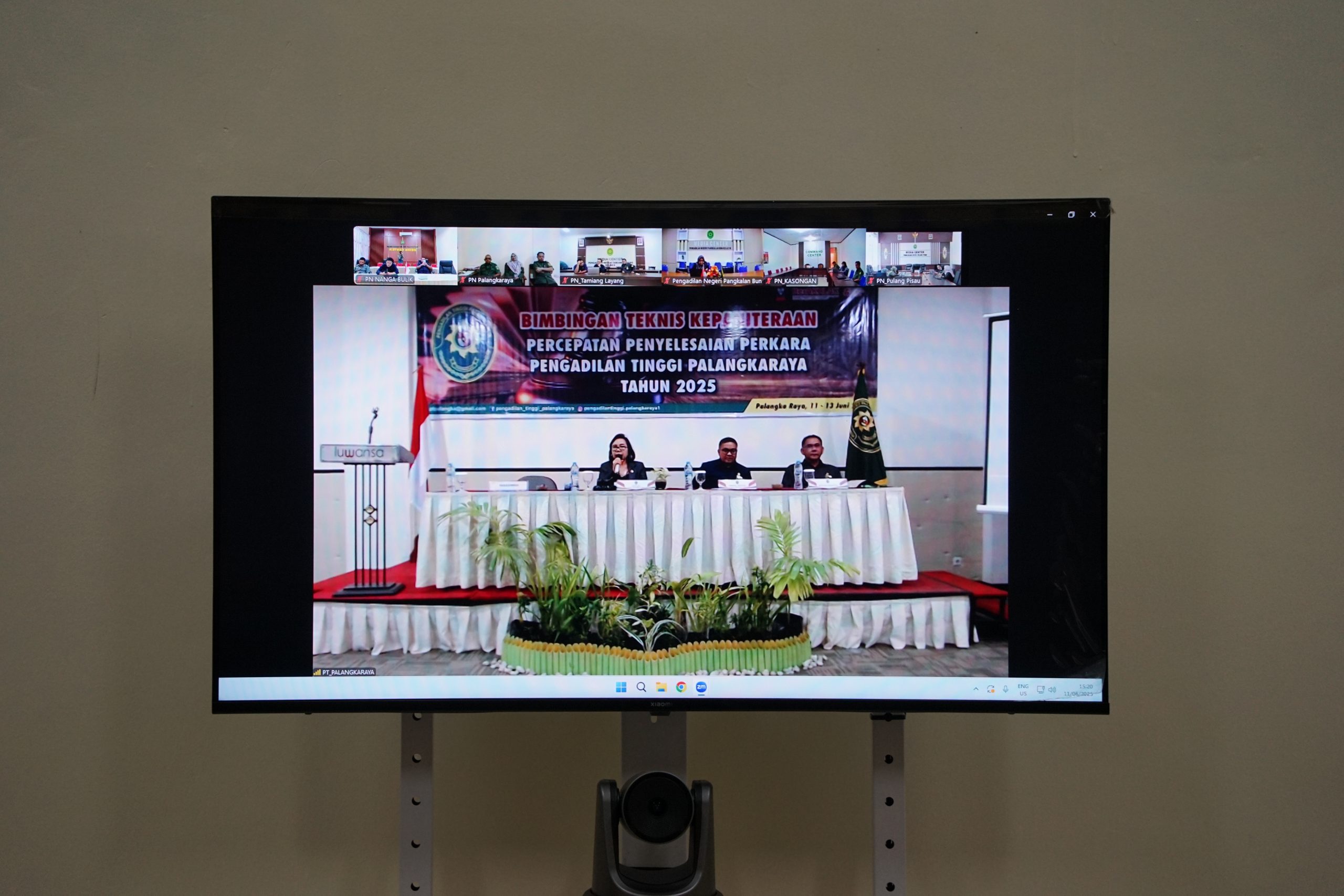 Bertempat di Ruang Media Center Pengadilan Negeri Nanga Bulik, Hakim Pengadilan Negeri Nanga Bulik beserta Jurusita Pengganti Pengadilan Negeri Nanga Bulik mengikuti kegiatan Bimbingan Teknis Kepaniteraan Dengan Tema “Percepatan Penyelesaian Perkara” yang diselenggarakan oleh Pengadilan Tinggi Palangkaraya secara daring.