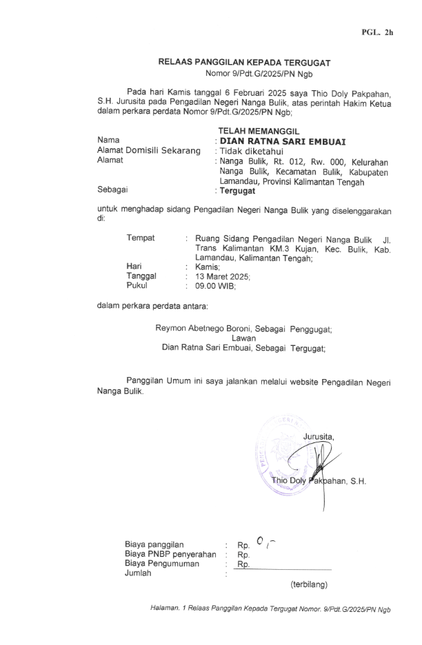 | 1. | RELAAS PEMBERITAHUAN PUTUSAN KEPADA TERGUGAT NOMOR PERKARA 9/Pdt.G/2025/PN Ngb