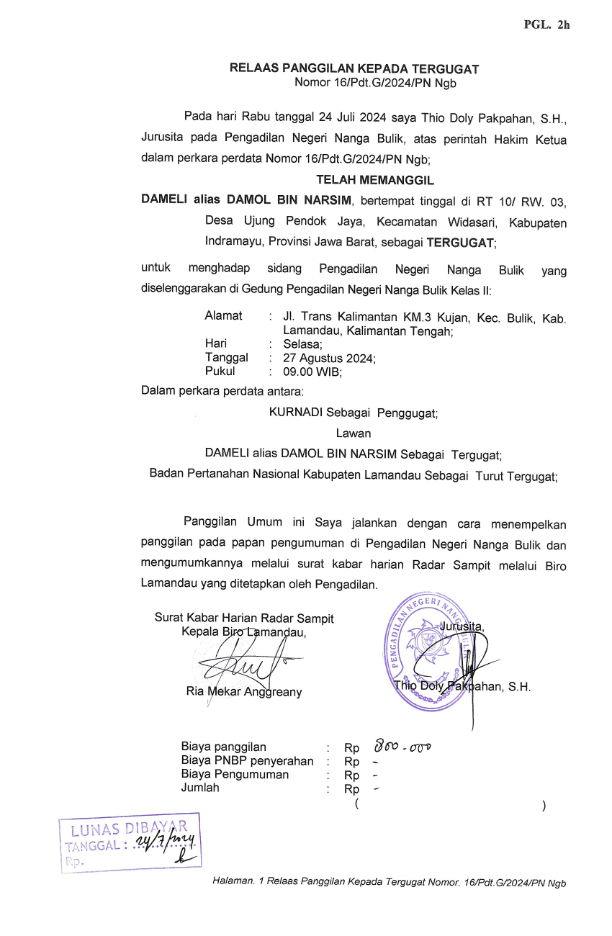 1. RELAAS PEMBERITAHUAN PUTUSAN KEPADA TERGUGAT SIDANG NOMOR PERKARA 16/Pdt.G/2024/PN Ngb