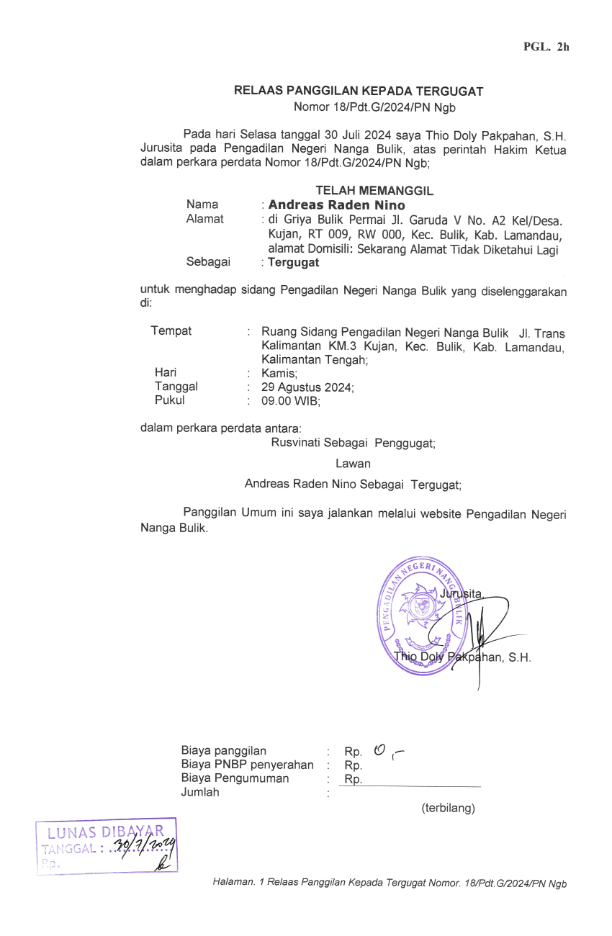 1. RELAAS PEMBERITAHUAN PUTUSAN KEPADA TERGUGAT SIDANG NOMOR PERKARA 18/Pdt.G/2024/PN Ngb