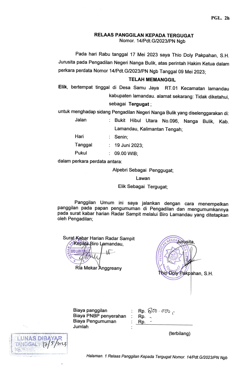 | 1. | RELAAS PANGGILAN TERGUGAT SIDANG NOMOR PERKARA 14/Pdt.G/2023/PN Ngb