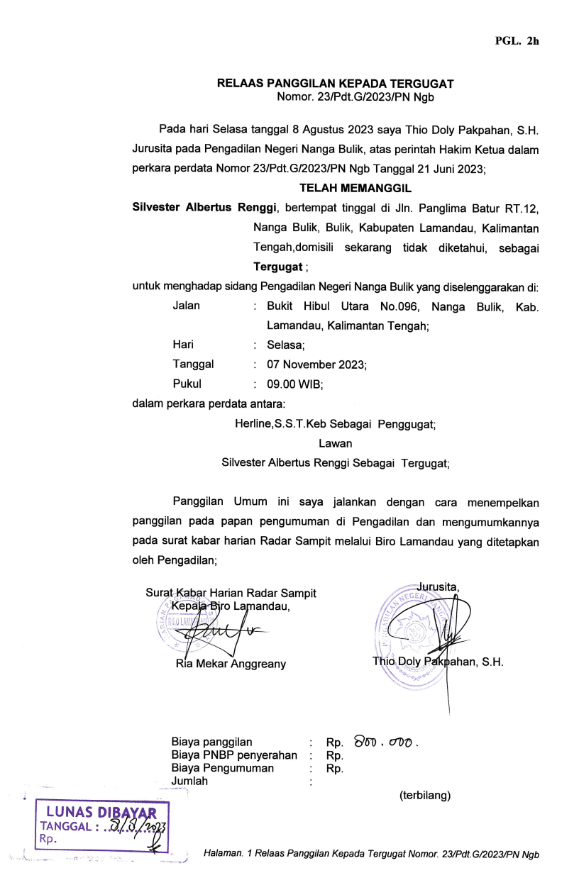 | 1. | RELAAS PANGGILAN TERGUGAT SIDANG NOMOR PERKARA 23/Pdt.G/2023/PN Ngb
