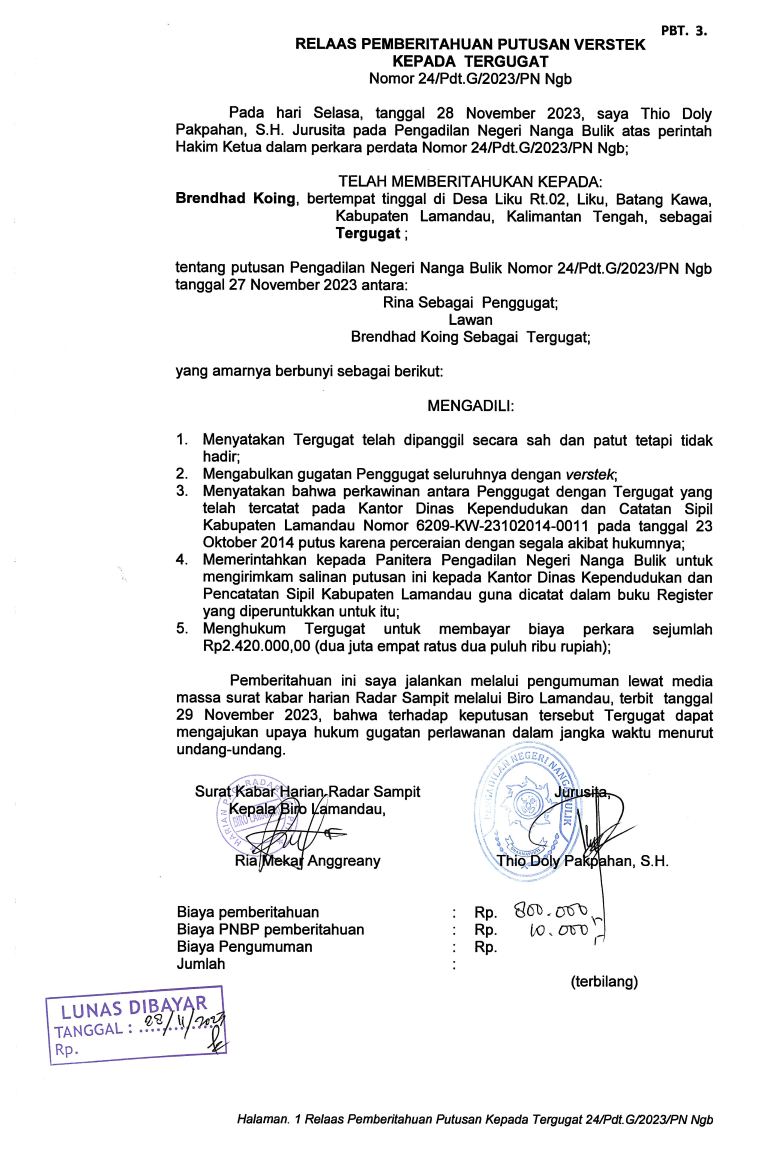 | 1. | RELAAS PANGGILAN TERGUGAT SIDANG NOMOR PERKARA 24/Pdt.G/2023/PN Ngb