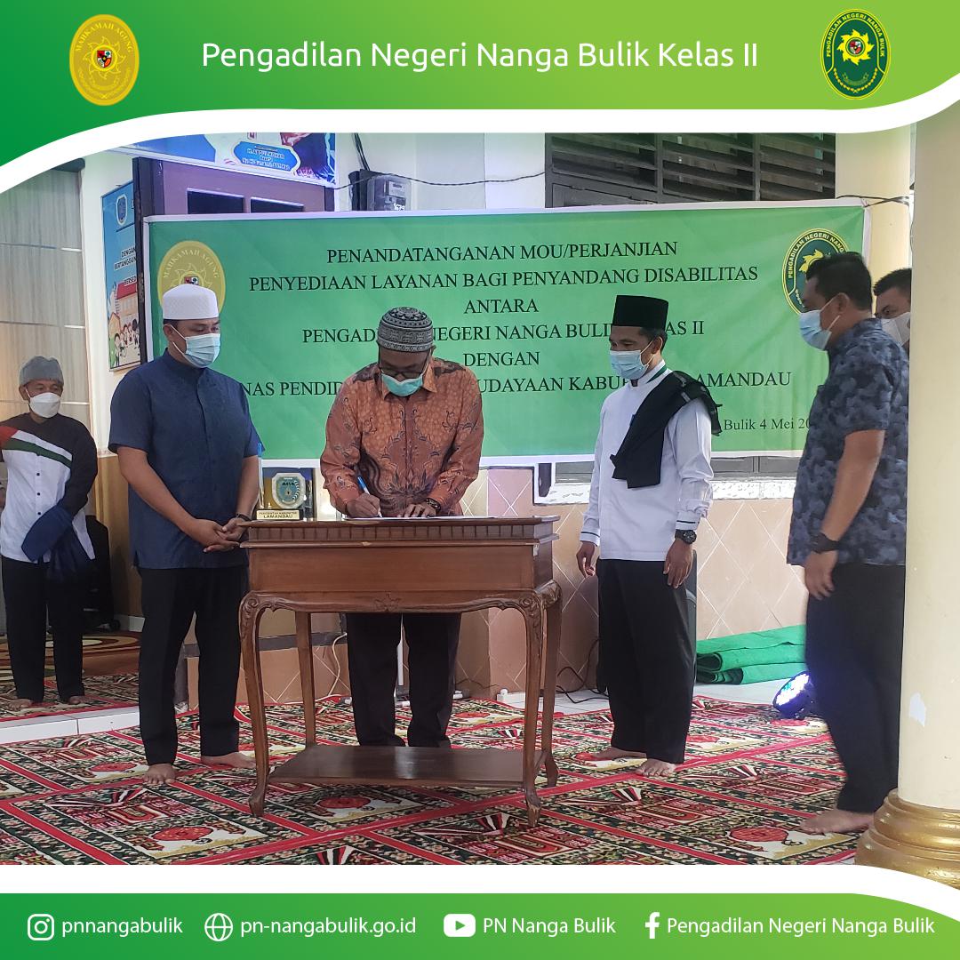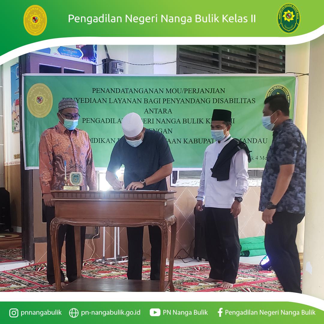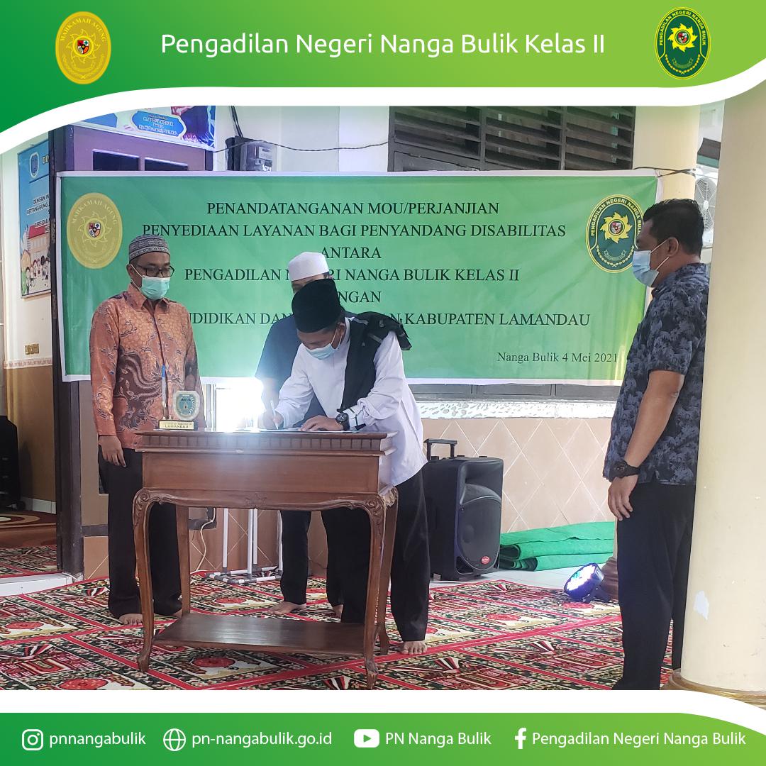 Nanga Bulik – 4 Mei 2021 | Pengadilan Negeri Nanga Bulik Kelas II melaksanakan Kegiatan Penandatanganan Perjanjian Kerja Sama/MOU dengan Dinas Pendidikan dan Kebudayaan Kabupaten Lamandau dalam Penyediaan Layanan Bagi Penyandang Disabilitas pada bertempat di Dinas Pendidikan dan Kebudayaan Kabupaten Lamandau.