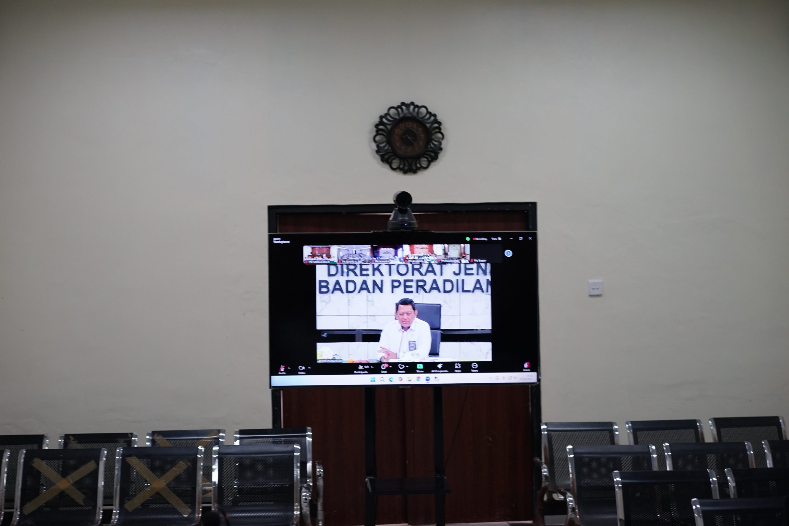 Ketua Pengadilan Negeri Nanga Bulik Bapak Evan Setiawan Dese, S.H., M.H. dan didampingi oleh Hakim, Panitera, Sekretaris dan Seluruh Pegawai Pengadilan Negeri Nanga Bulik menghadiri undangan secara daring melalui Zoom Meeting Pertemuan Rutin Sarasehan Interaktif (PERISAI) Episode 3 Tahun 2025 yang bertempat di Ruang Sidang Pidana.