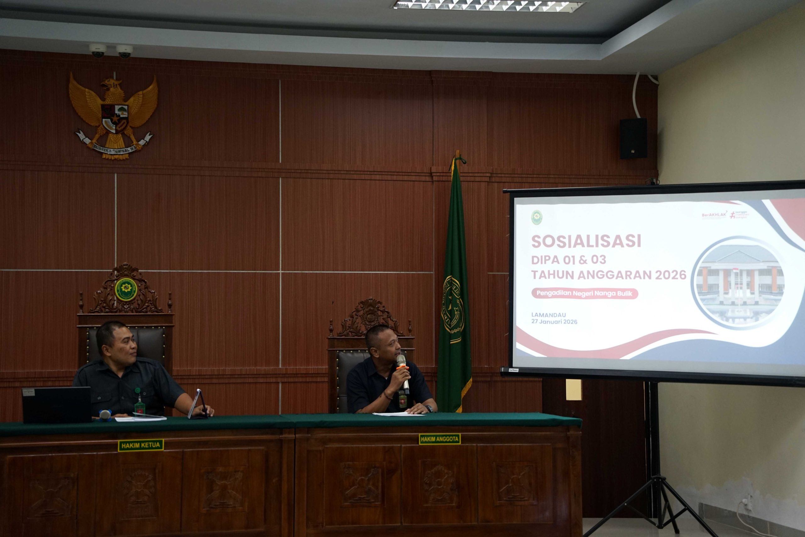 Pengadilan Negeri Nanga Bulik melaksanakan Kegiatan Sosialisasi Dipa 01 & 03 Tahun Anggaran 2026. Kegiatan ini dipimpin oleh Sekretaris Pengadilan Negeri Nanga Bulik, Bapak Aang Sutopo, S.H. dan di hadiri oleh Ketua, Hakim, Pejabat Struktural, Pejabat Fungsional dan Pegawai yang bertempat di Ruang Sidang Cakra Pengadilan Negeri Nanga Bulik.